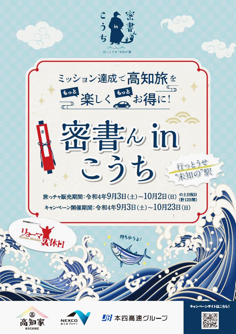 西日本高速道路(NEXCO西日本、前川秀和社長)などは、キャンペーン「リョーマの休日 密書(みっしょ)んinこうち『行っとうせ〝未知の〟駅』」を、9月3日から高知県内で開催する=写真。目的地とそこでの「ミッション」が書かれた「密書」を販売...