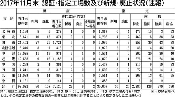 国土交通省は2017年11月末時点の認証・指定工場数および新規・廃止状況をまとめた。認証工場は前月比18件減の9万2072工場となった。指定工場数は4件増の3万57工場となり、5カ月連続で増加した。専門認証工場数も11件増の7120工場と...