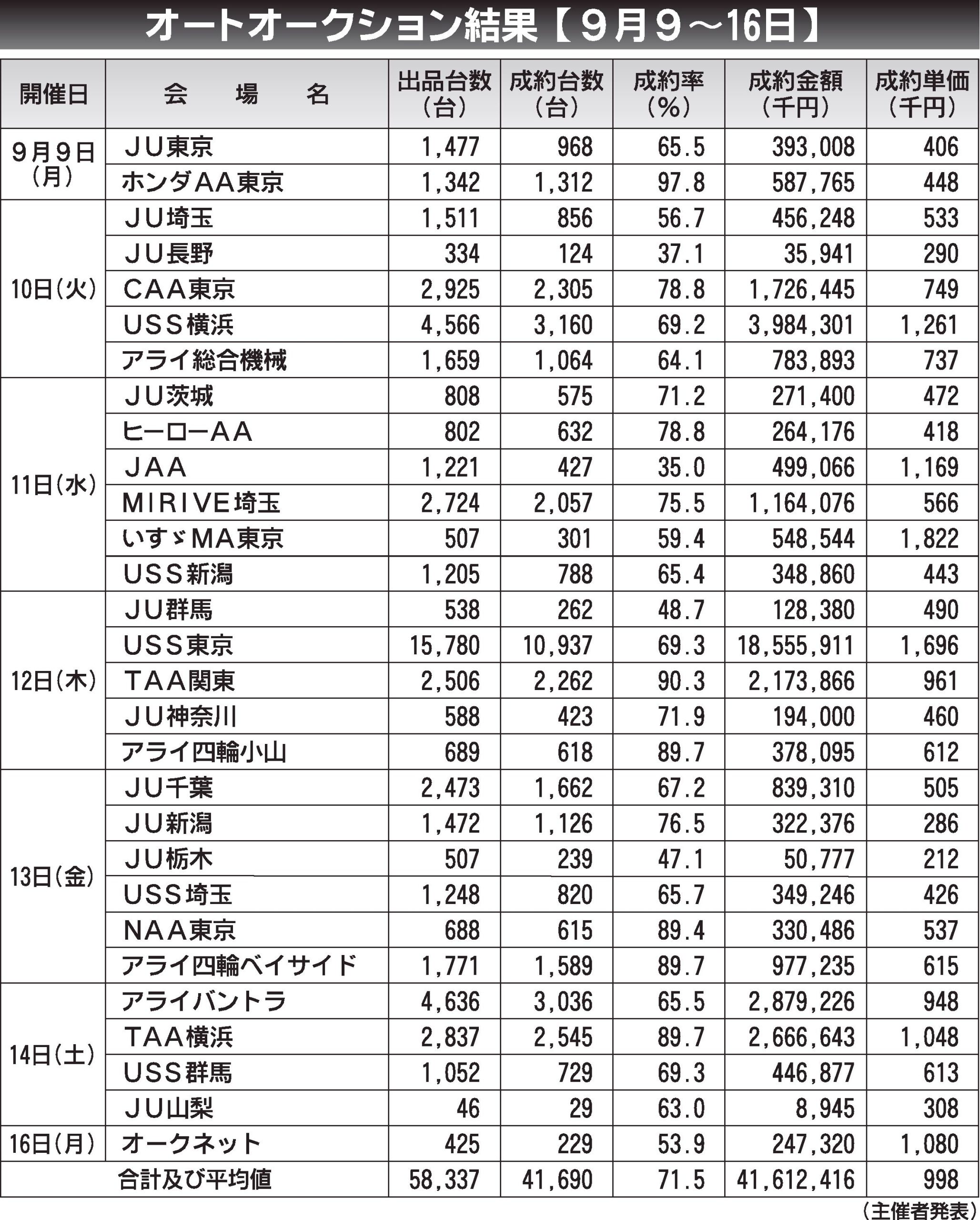 〈オートオークション結果〉首都圏 2024/9/9~16