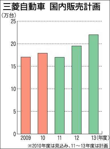 三菱自動車は2011年度の国内新車販売計画を前年比5%減の17万台に設定した。また、国内市場は年内に底打ちすると予測し、12年度は11年度計画比14・7%増の19万5千台を目指す。新中期経営計画で設定した13年度の22万台達成に向け、段階...