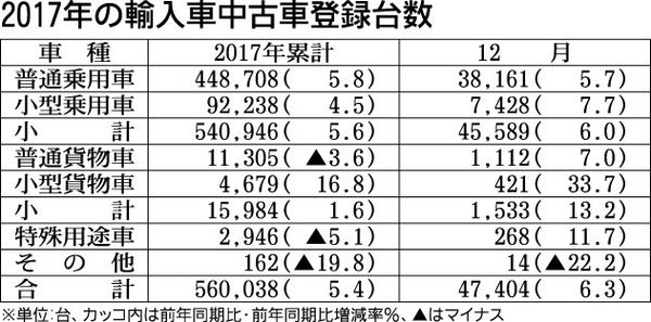 日本自動車輸入組合(JAIA)が17日発表した輸入車の中古車登録台数は、前年比5・4%増の56万38台と4年連続のプラスだった。 車種別では、乗用車が同5・6%増の54万946台。そのうち普通乗用車が同5・8%増の44万8708台、小型乗...