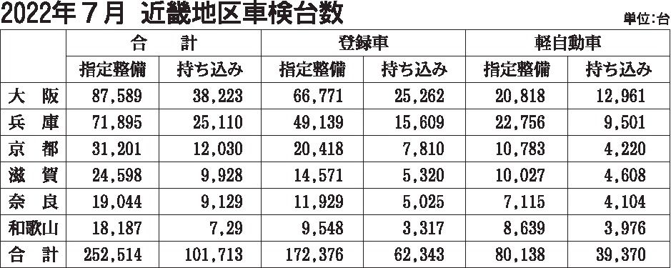 近畿2府4県の2022年7月の継続検査(車検)台数(軽自動車を含む)は、前年同月比0・9%減の35万4227台となり、2カ月連続で前年を下回った。登録車は同0・5%減の23万4719台、軽は同1・6%減の11万9508台で、どちらも2カ月...