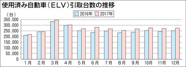 2017年暦年(1~12月)の使用済み自動車(ELV)引取台数が3年ぶりに前年実績を上回った。自動車リサイクル促進センター(JARC)のまとめによると、17年実績は前年比7・7%増の327万7142台だった。1~12月まですべての月で前年...