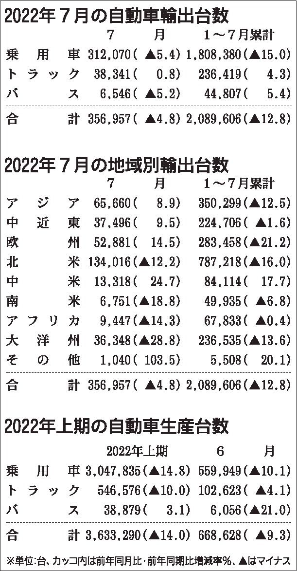 また、同日発表した7月の輸出台数は同4.8%減の35万6957台で、7カ月連続で前年を下回った。仕向け地別では最も台数が多い北米が同12.2%減の13万4016台と落ち込んだ。アジアは同8.9%増の6万5660台で、このうち中国は同0.3%減の2万7947台だった。