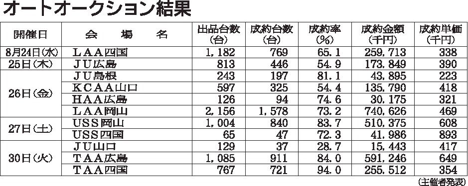 〈オートオークション結果〉中四国地区 2022/8/24~30