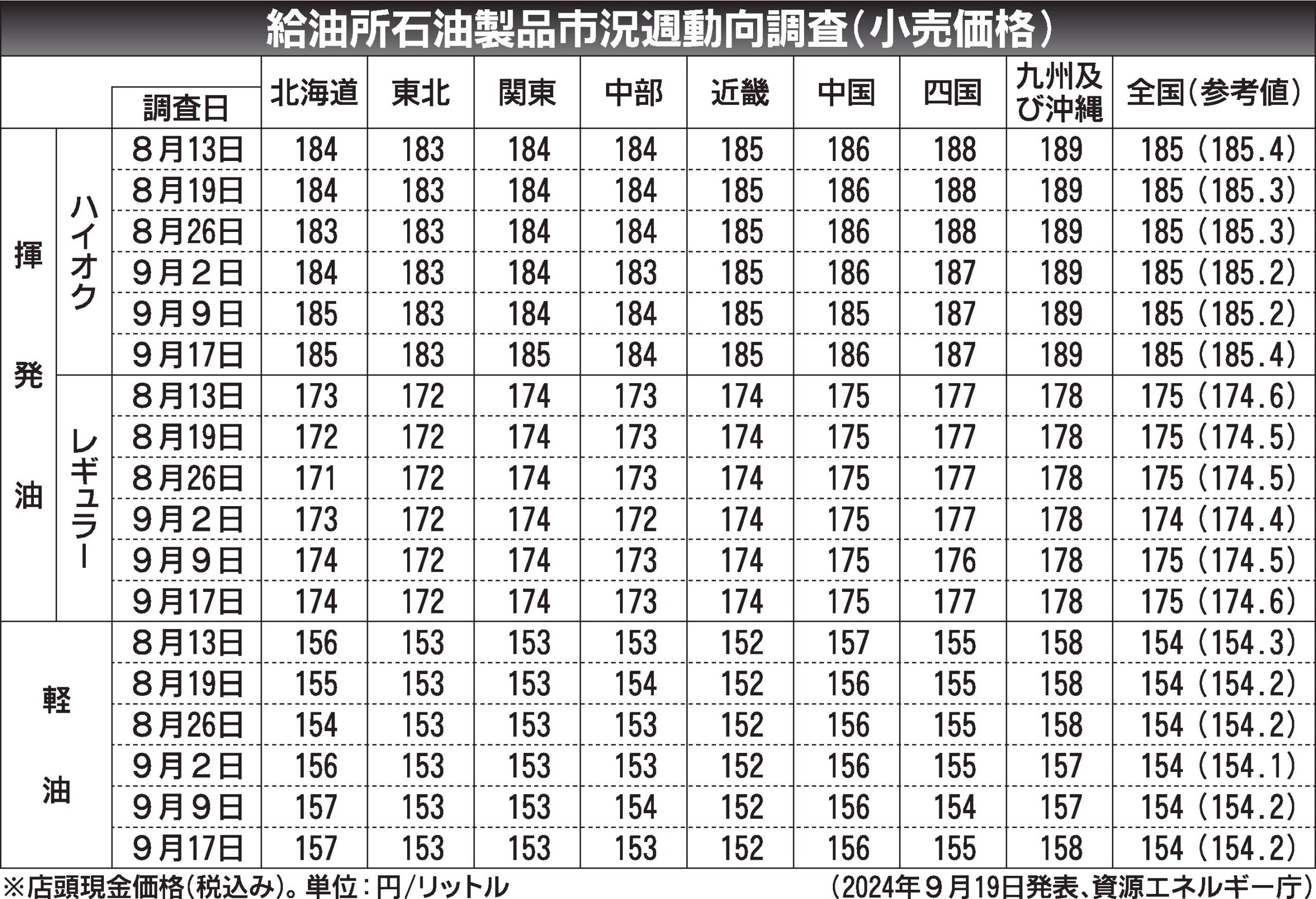 〈給油所石油製品市況週動向調査(小売価格)〉2024/08/13~09/17
