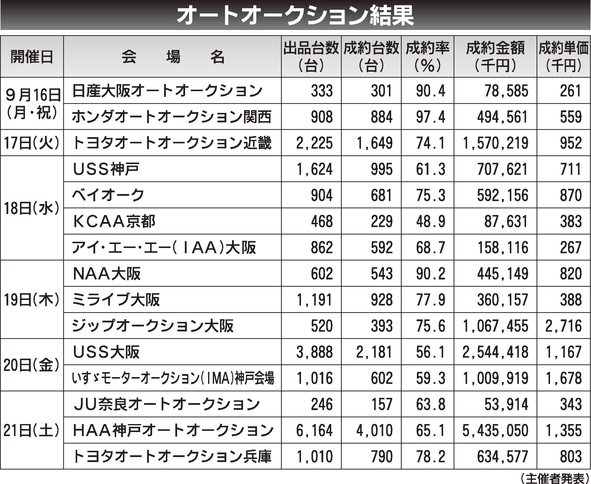 〈オートオークション結果〉近畿地区 2024/9/16~21