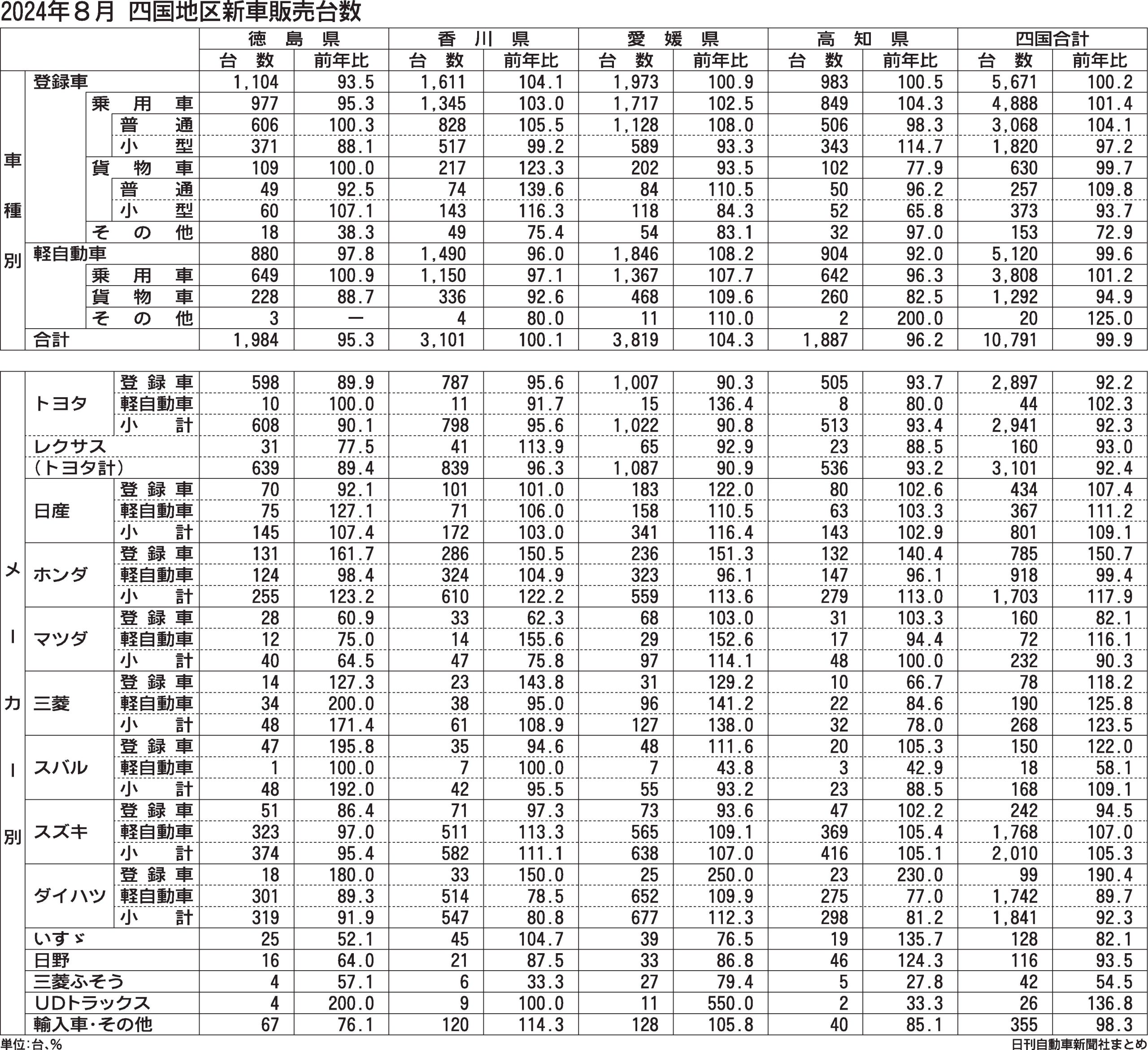 四国地区の2024年8月新車販売台数(登録車+軽自動車)は1万791台と前年同月比0.1%減で踏みとどまった。全国平均(同3.5%減)に対して、四国地区はほぼ前年並みで推移するなど他地区と比べて健闘したといえる。県別では愛媛県が同4.3%...