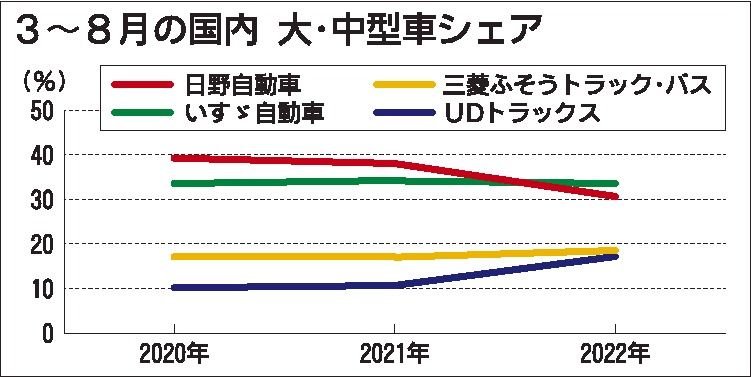普通トラック(積載量4㌧以上、大型・中型トラックの合計)の新車販売シェアが変動している。2022年3~8月はいすゞ自動車が33・6%で日野自動車に代わって首位に立ち、UDトラックスは前年同期の10・7%から17・2%にシェアを伸ばした。日...