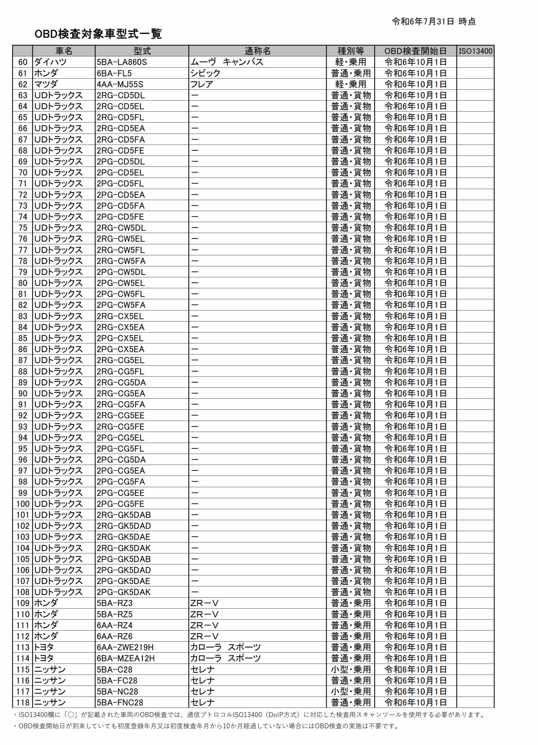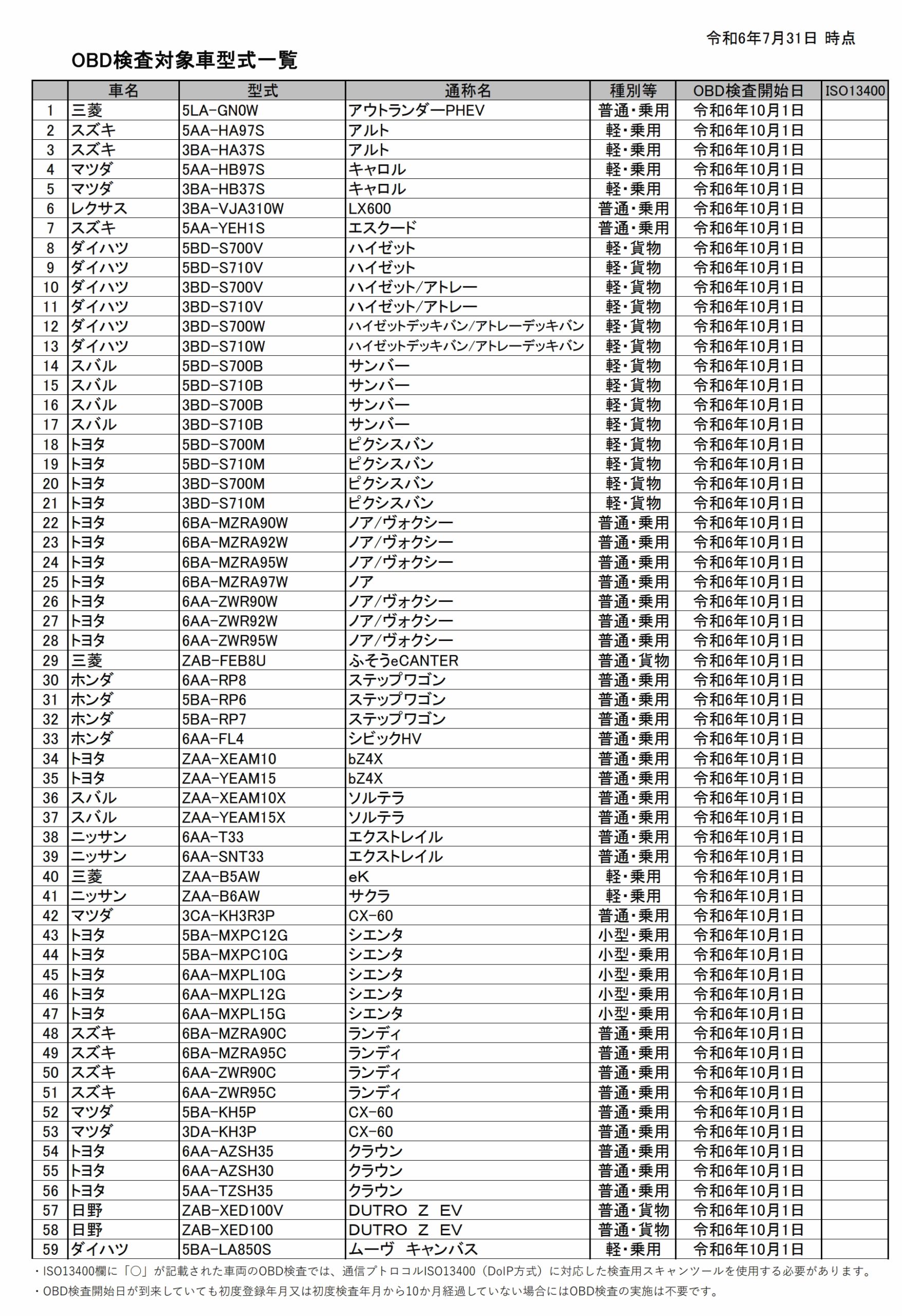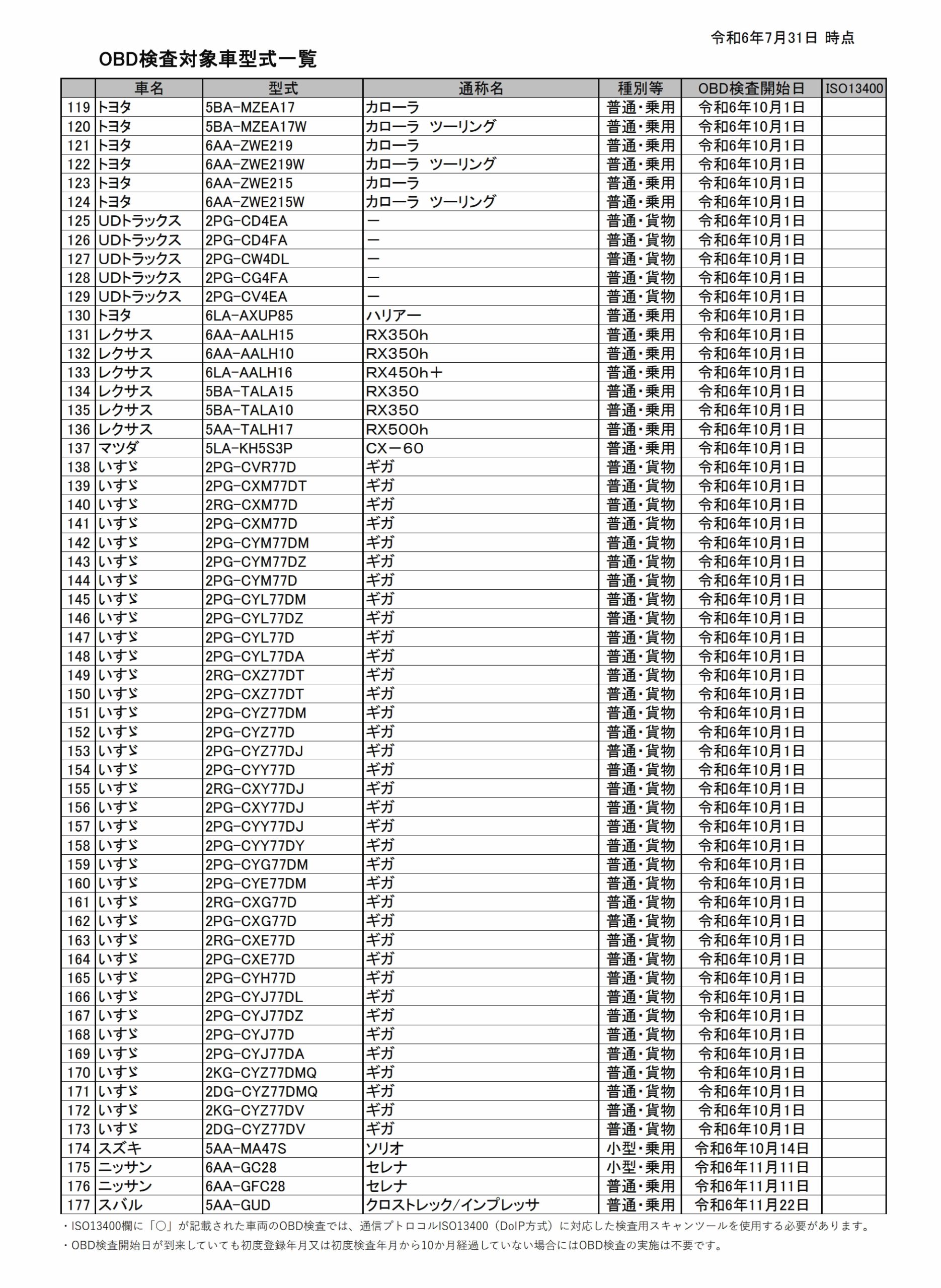 〈OBD検査〉対象車種の型式一覧(2024/7/31現在)
