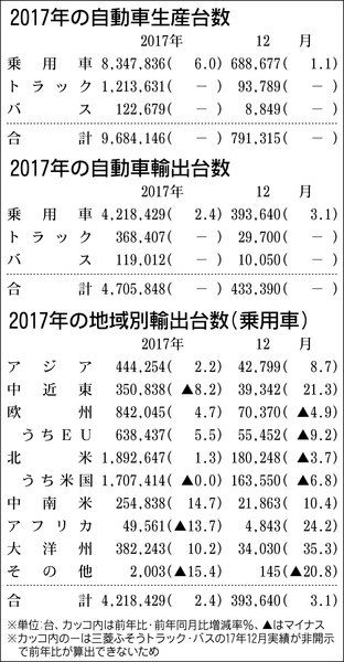【2017年の自動車生産/輸出台数と地域別輸出台数(乗用車)】