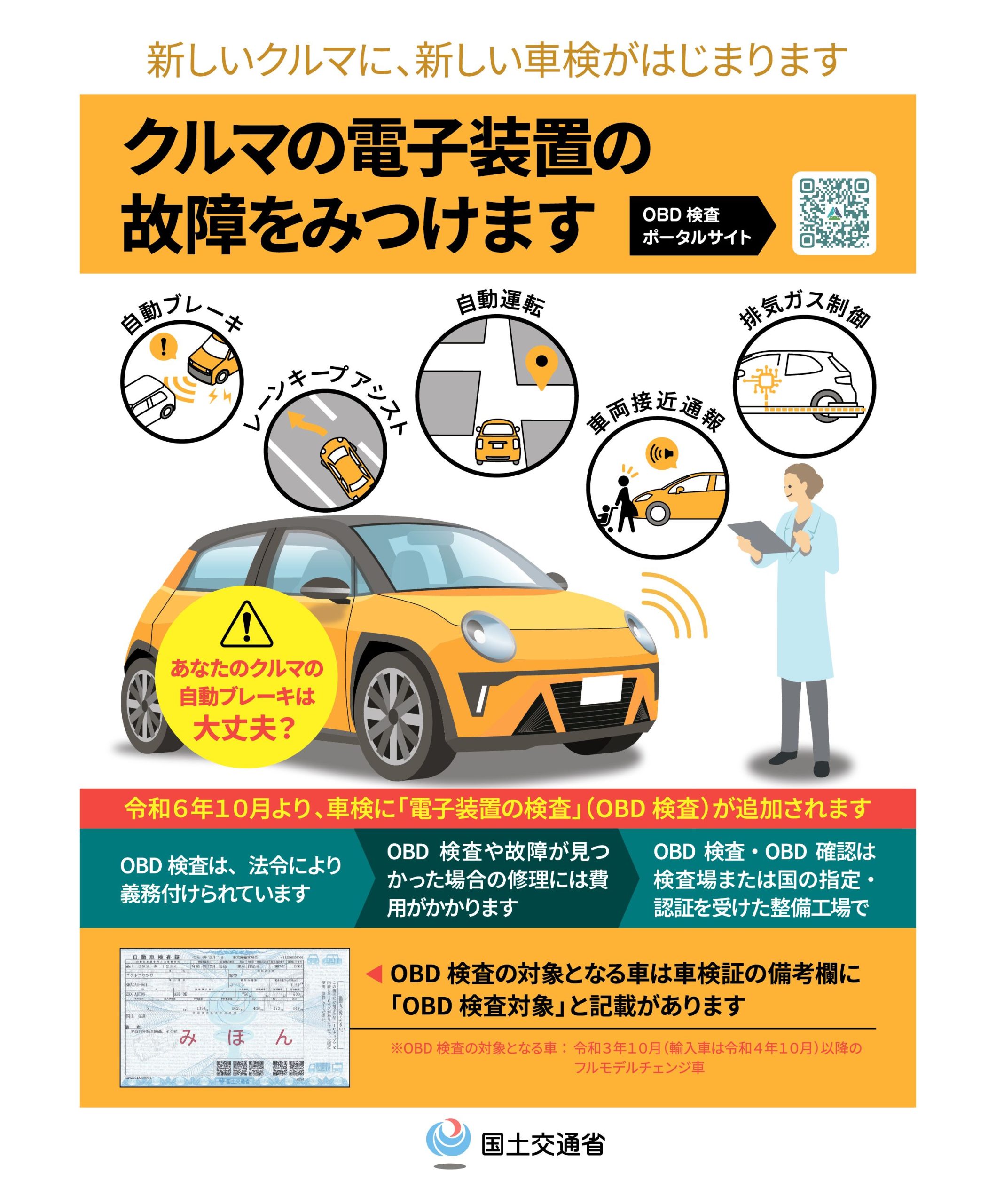 また、国土交通省はOBD検査の開始に合わせて、「新しいクルマに、新しい車検がはじまります」をキャッチフレーズとしたOBD検査を紹介するチラシやポスターを作成しました。これらは整備事業者が顧客への入庫案内などで活用できるように「OBD検査ポータル」でダウンロードすることができます。