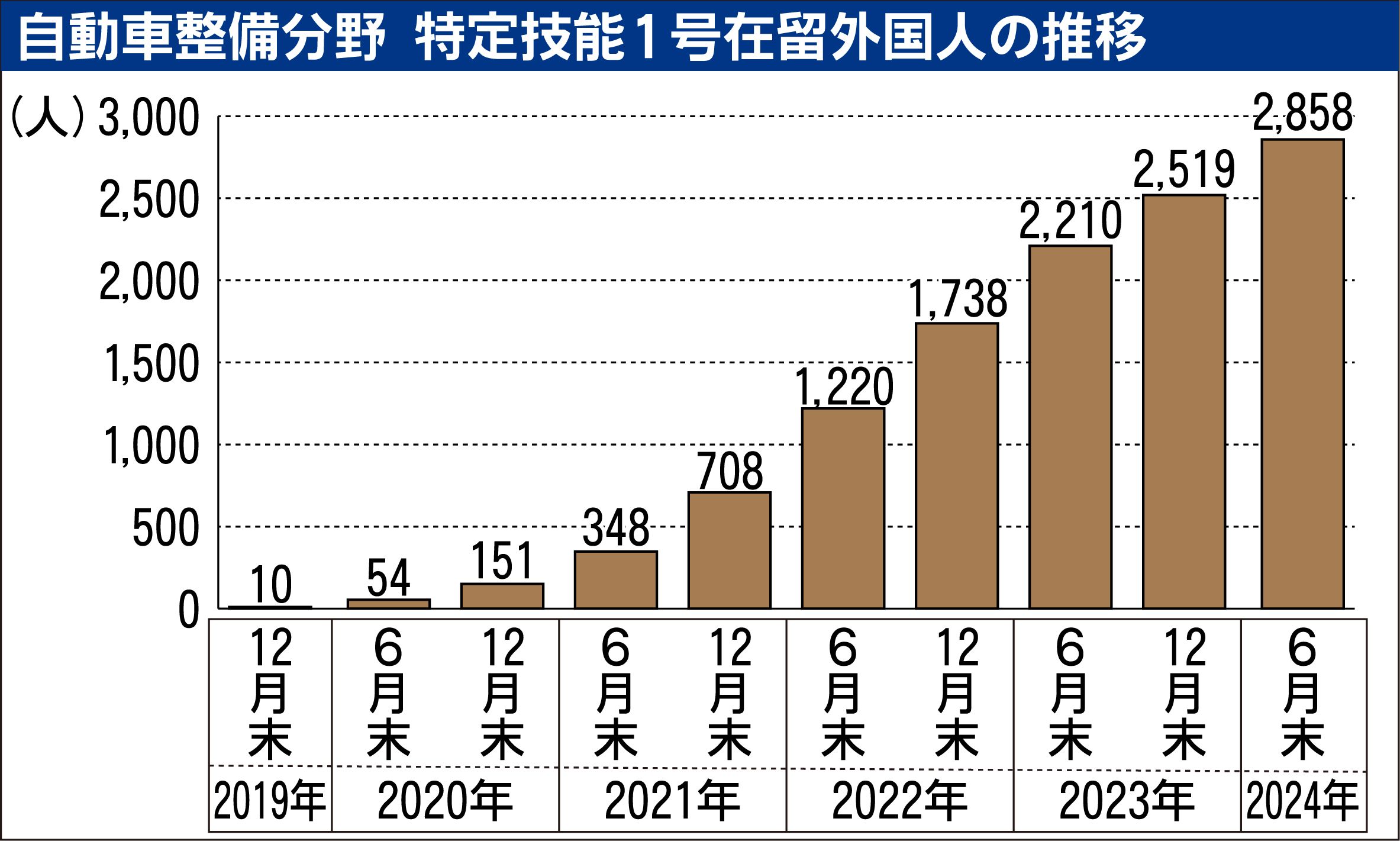 出入国在留管理庁がこのほど公表した6月時点の特定技能在留外国人数(速報値)によると、自動車整備分野の「特定技能1号在留外国人」は2858人だった。整備士の高齢化やなり手の不足などを背景に、外国人材の採用に力を入れる整備事業者が増え、この2...