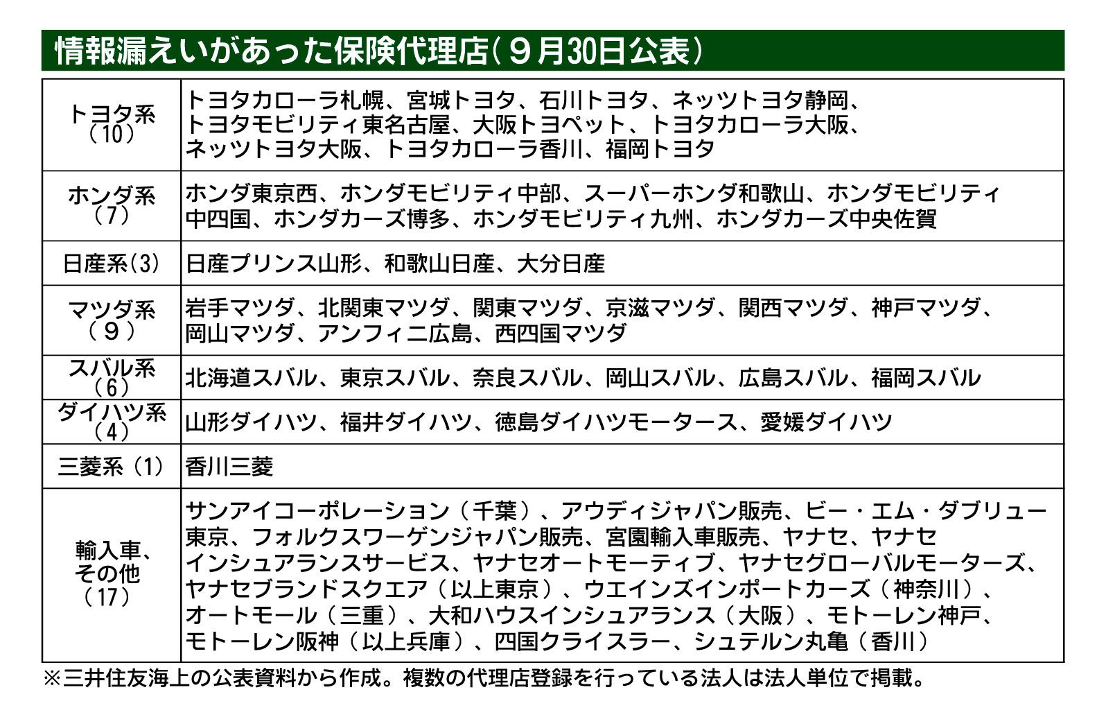 損害保険大手4社による一連の情報漏えい問題で、三井住友海上火災保険は9月30日、保険代理店への出向者が他社の保険契約情報1万2846件(13代理店分)を持ち出して出向元の自社に報告していたと発表した。大半が自動車ディーラー(乗合保険代理店...