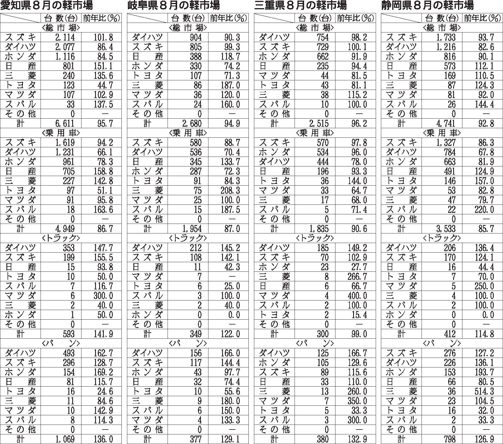 〈中部4県8月の軽市場〉愛知県/岐阜県/三重県/静岡県