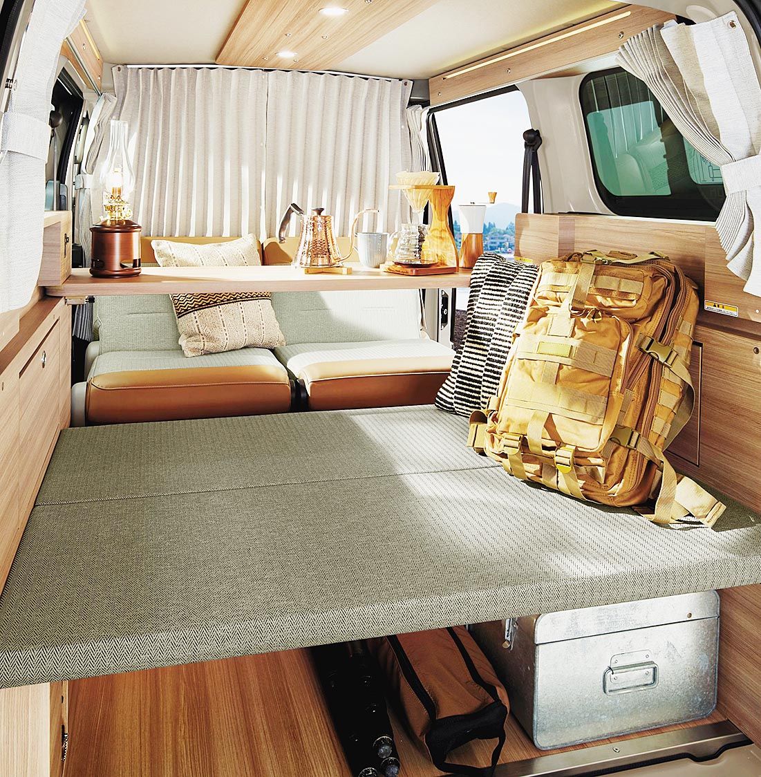 NV200バネットマイルームは「キャラバン」に続くマイルームシリーズの第2弾となる。駐車時に反転させることでソファとしても使える「2in1シート」やベッドキットのほか、ウッドルーフパネルや間接照明、カーテンなどを装備する。木目調ステッカーや質感の高いヘリンボーン生地も用い、ナチュラルで高級感ある空間を演出した。