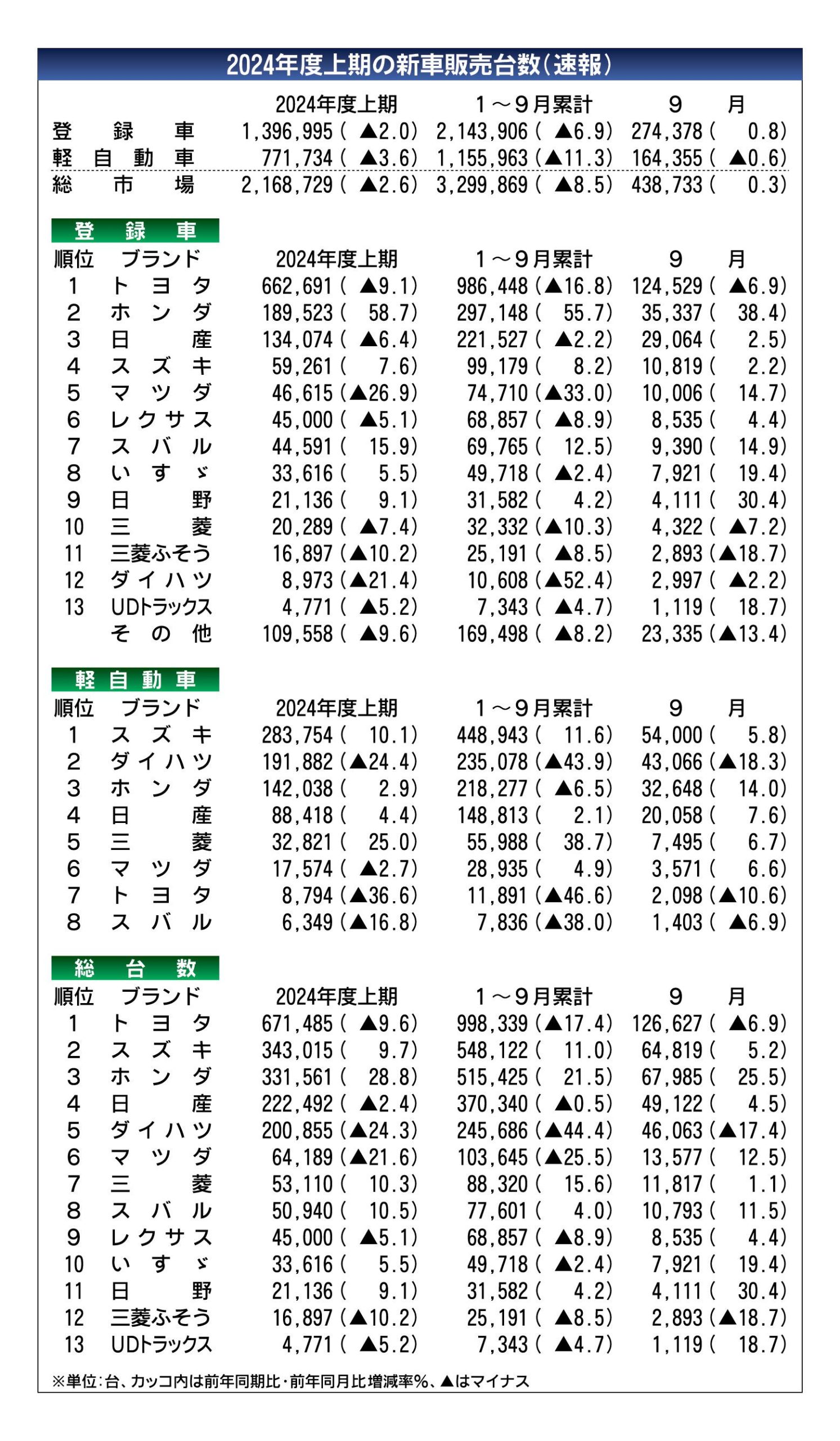 2024年4~9月の国内新車販売、2.6%減 2年ぶり前年割れ 一部の認証不正で回復に水