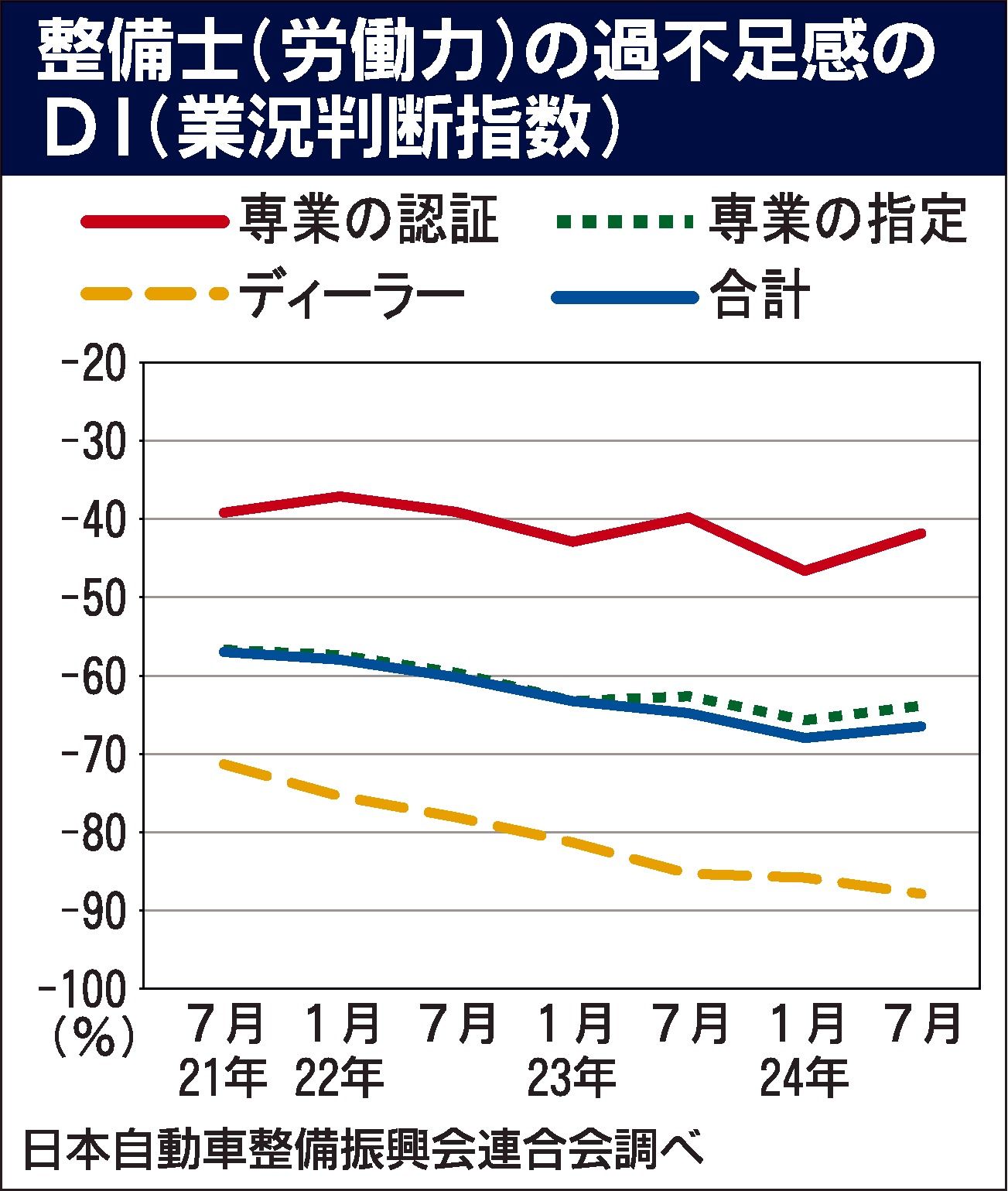 日本自動車整備振興会連合会(日整連、喜谷辰夫会長)がまとめた第57回「整備需要等の動向調査」(7月調査)によると、整備士(労働力)の過不足感DI(業況判断指数=プラスと回答した事業者の割合からマイナスを引いた数値)は1月調査から1.5㌽上...
