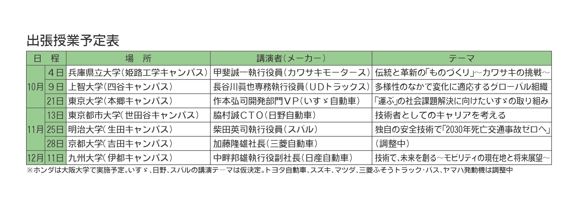 日本自動車工業会(片山正則会長)は、「大学キャンパス出張授業」を今年も開く。2013年から開催しており、今年で11回目となる。今年は4日の兵庫県立大学でのカワサキモータース・甲斐誠一執行役員の授業を皮切りに始まる。1日時点でカワサキモータ...