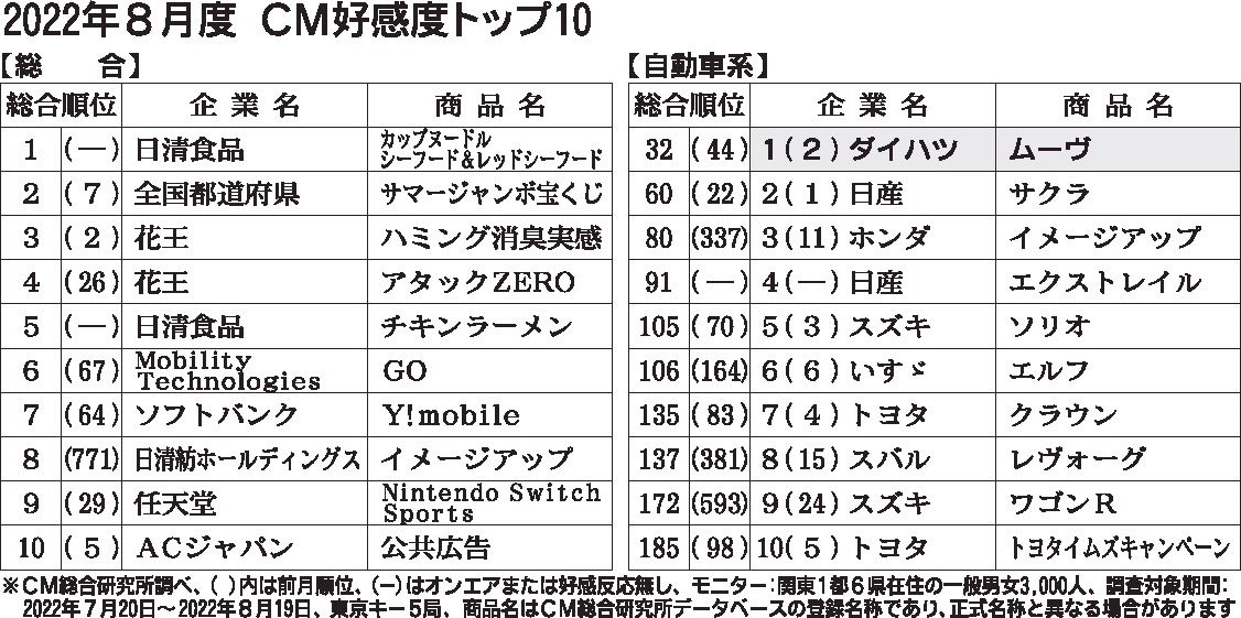 〈2022年8月度CM好感度ランキング〉視聴者の心を和ませるダイハツ「ムーヴ」が首位