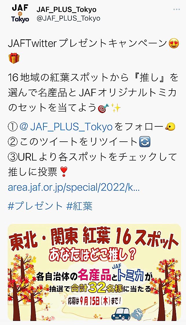 日本自動車連盟(JAF)関東本部(加藤和夫本部長)は15日まで東北・関東の合同企画として「JAFツイッタープレゼントキャンペーン東北・関東紅葉16スポット~あなたはどこ推し?~」を実施している=写真。16の自治体と連携し、各地域のおすすめ...