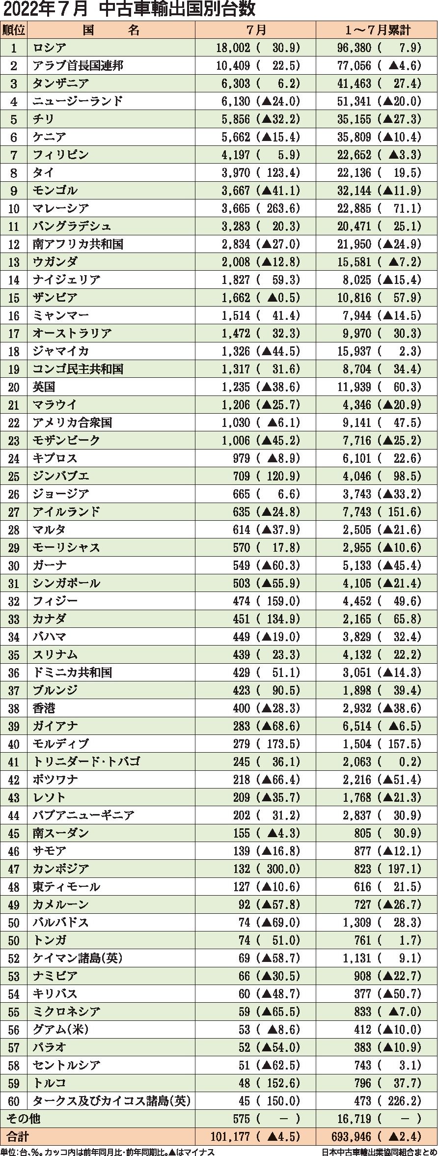 2022年7月の中古車輸出、ロシア向け2カ月連続首位
