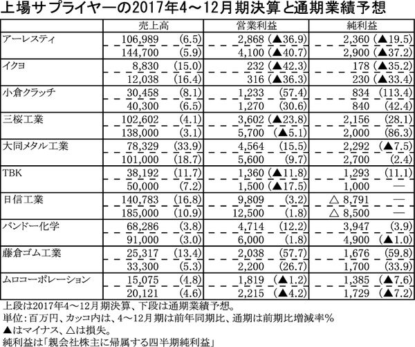 【上場サプライヤーの2017年4~12月期と通期業績予想】
