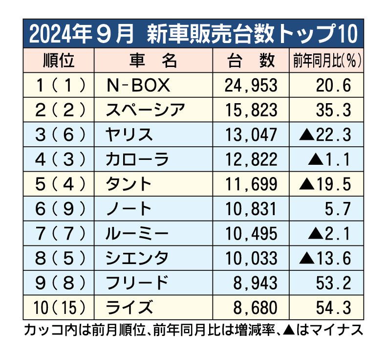 9月実績は、エヌボックスが4カ月連続の総合首位だった。ダイハツ工業からのOEM(相手先ブランドによる生産)車であるトヨタ「ライズ」が1年11カ月ぶりに上位10車種入りを果たした。