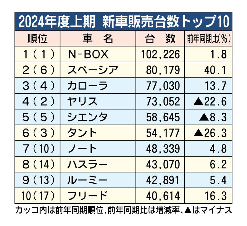 2024年4~9月の新車販売ランキング、N-BOXが3年連続トップ 2位はスペーシア