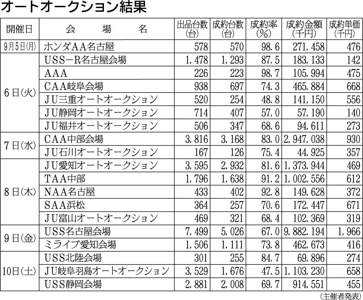 〈オートオークション結果〉中部地区 2022/9/5~10