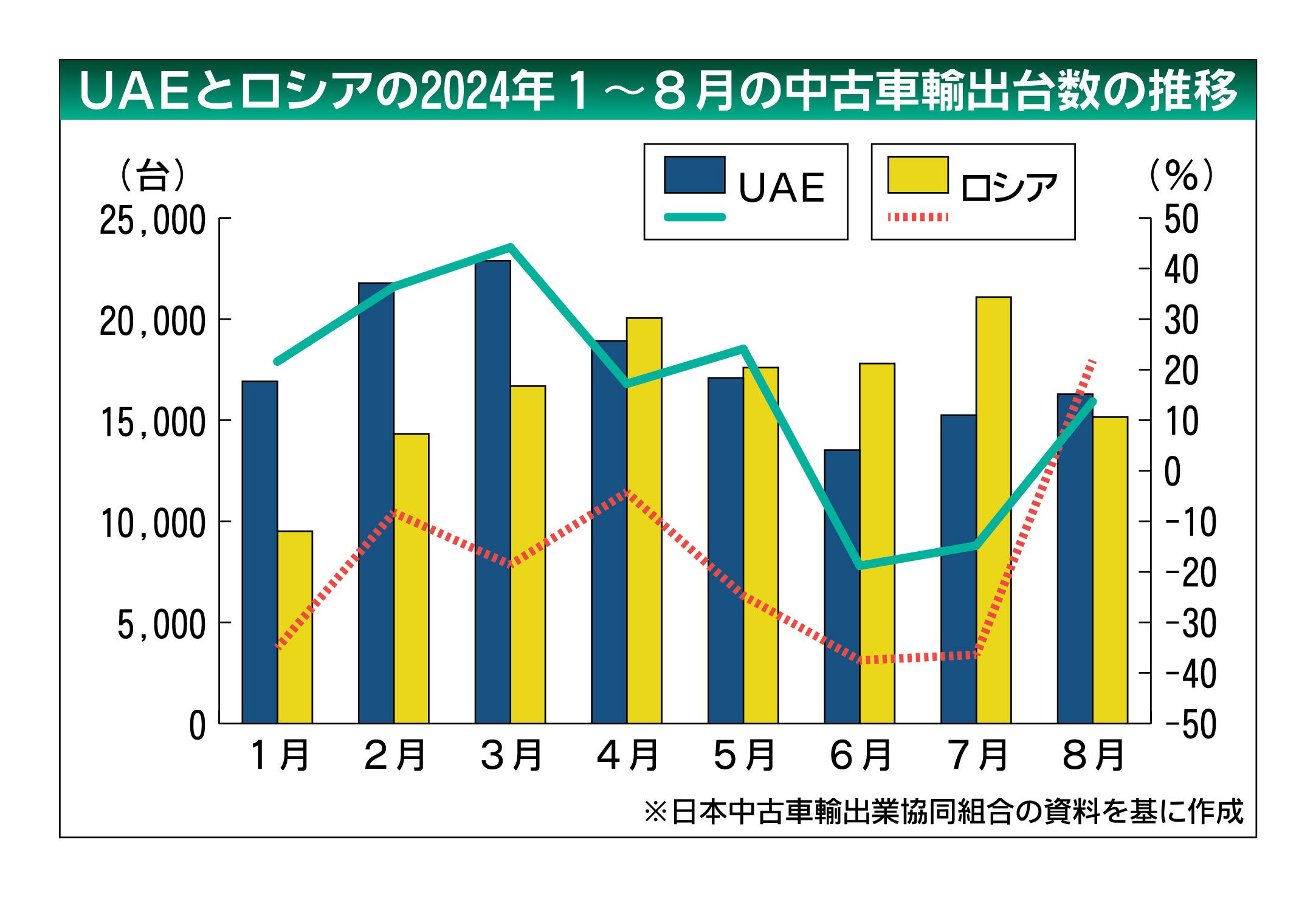 中古車輸出の仕向け地で、ロシアとアラブ首長国連邦(UAE)の首位争いが激しくなっている。日本中古車輸出業協同組合(JUMVEA、佐藤博理事長)が公表した2024年8月の国別中古車輸出台数(車両価格20万円以上)によると、UAEは前年同月比...