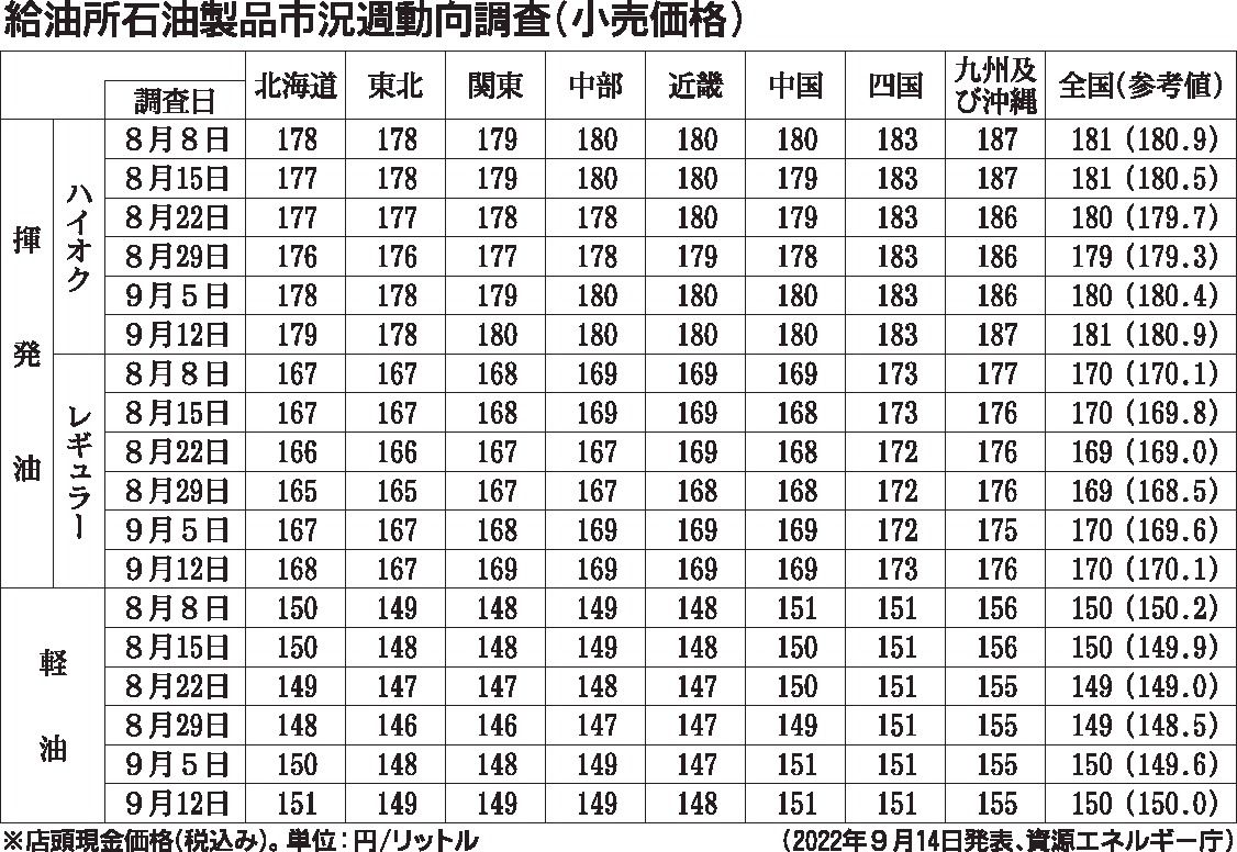 〈給油所石油製品市況週動向調査〉2022/8/8~9/12
