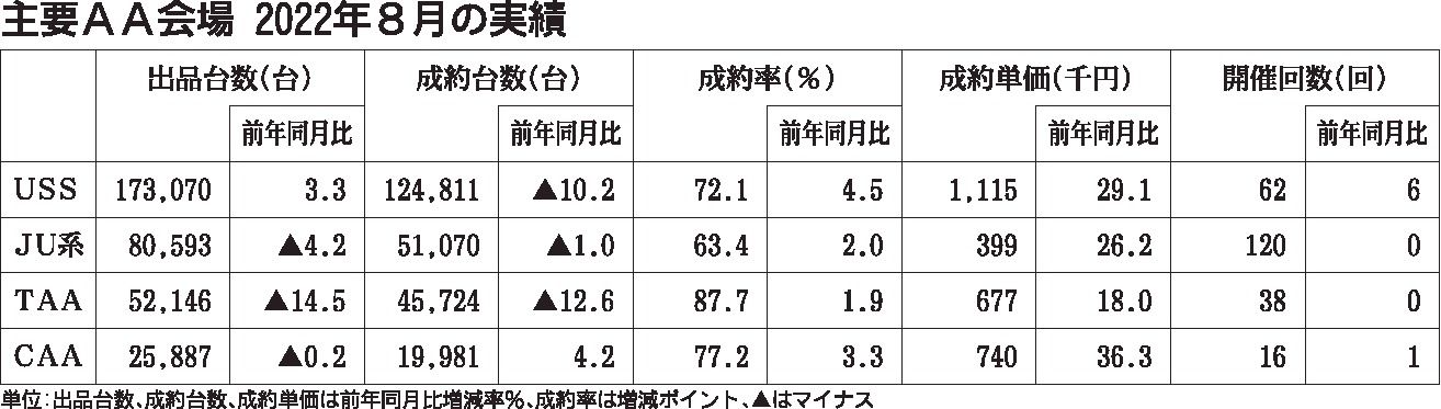 主要中古車オークション(AA)の取引価格が高止まりしている。2022年8月の実績は、主要AAの全てで、台当たりの平均成約単価が前年同月を上回った。最大手ユー・エス・エス(USS)は前年同月比29・1%増の111万5千円と3カ月連続で100...