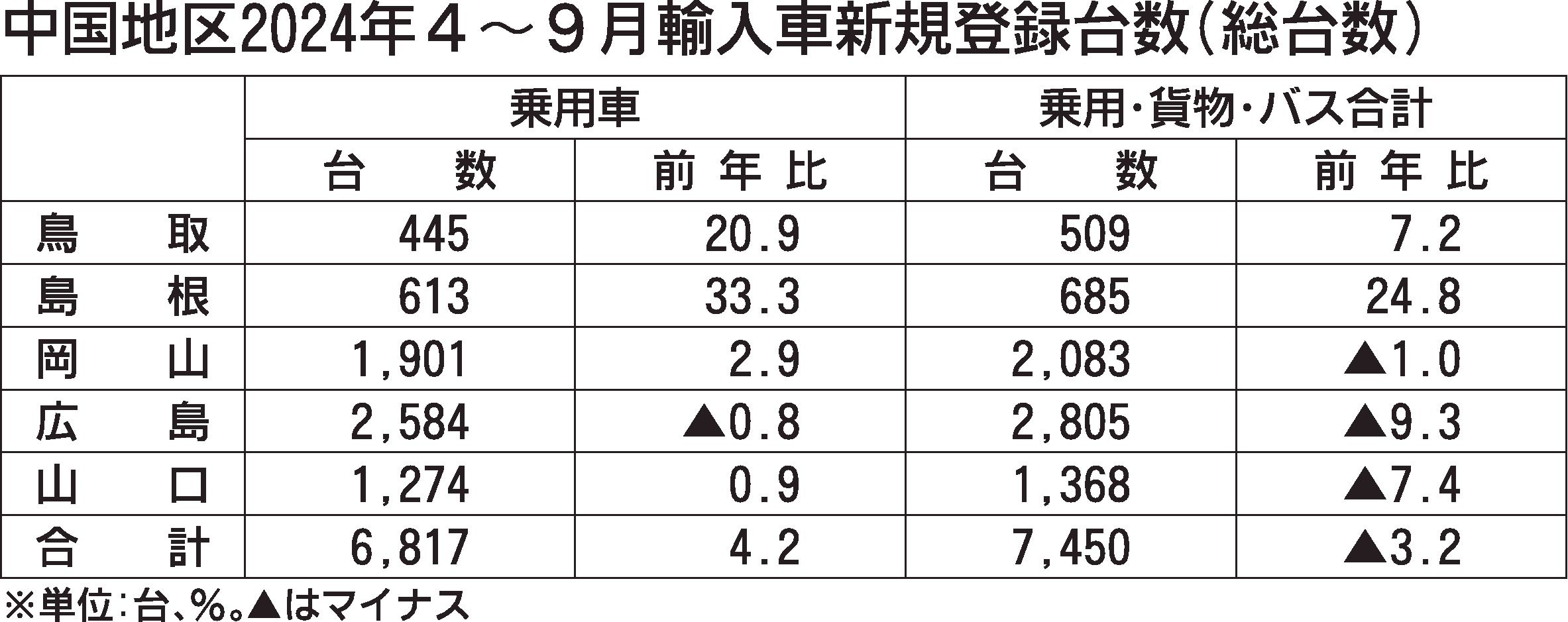 日本自動車輸入組合(JAIA)の発表によると、2024年度上期(4~9月)の中国地区の輸入車新規登録台数(外国メーカー車と日本メーカー車)は、前年同期比3.2%減の7450台だった。日本メーカーの海外生産車の輸入が増えた一方、外国メーカー...