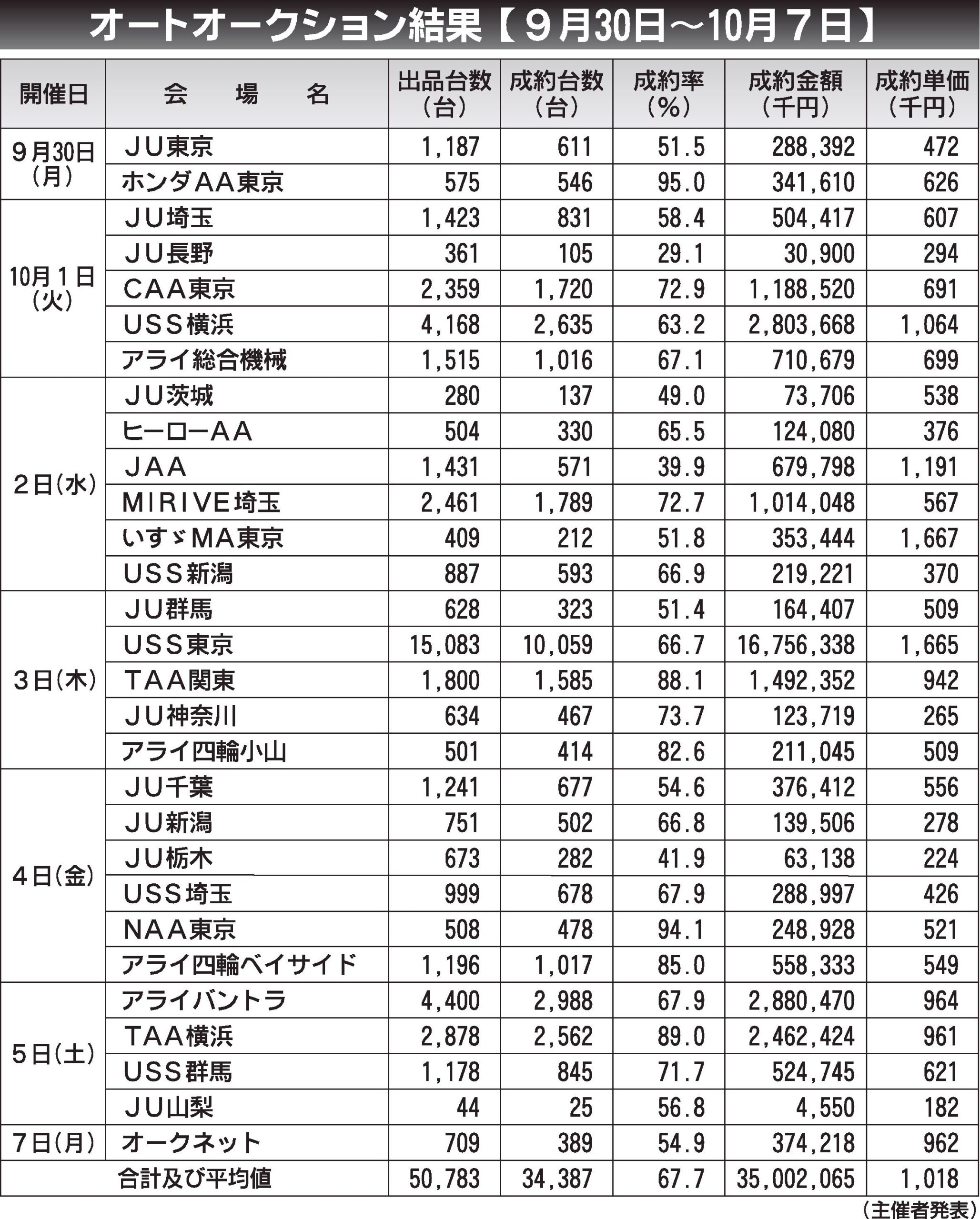 〈オートオークション結果〉首都圏 2024/9/30~10/7