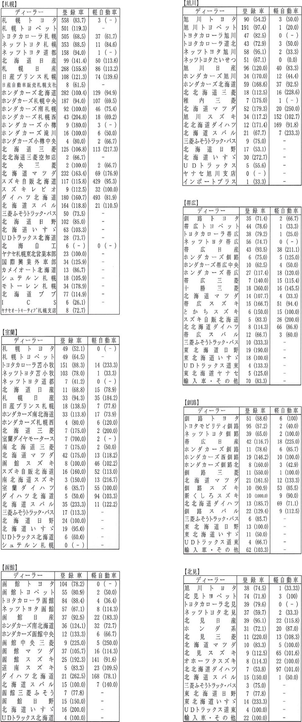 〈8月度全道管内別ディーラー別新車登録・届け出台数〉(カッコ内は前年同月比)※札幌管内ホンダ系・スズキ系の登録台数は自販連正会員分