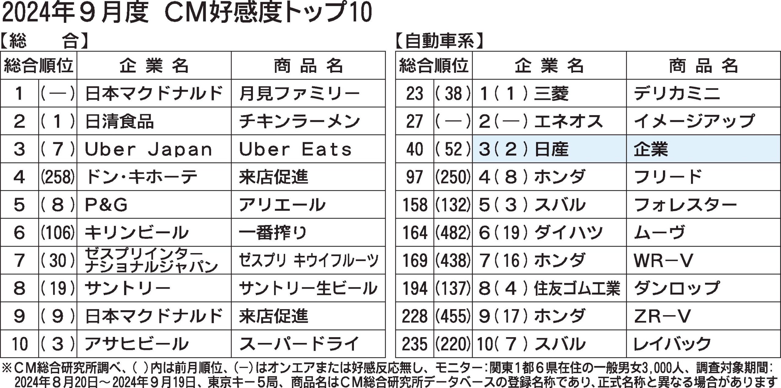 CM総合研究所(関根心太郎代表、東京都千代田区)は、2024年9月度のCM好感度ランキングを公表した。総合ランキングでは日本マクドナルドが首位。自動車業類は15カ月連続でトップテンを逃した。