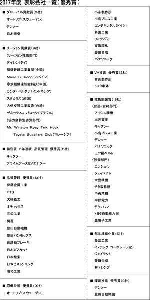 トヨタ自動車は、23日に名古屋市で開いた「2018年トヨタグローバル仕入先総会」で、17年度の技術開発や原価改善、品質管理などに貢献した部品メーカー各社を表彰した。今回から新たに、技術や工場などでの環境面の取り組みに寄与した企業に贈る「環...