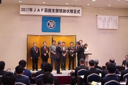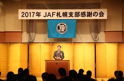◆札幌 日本自動車連盟(JAF)の札幌支部(横井隆支部長)は日、「2017年感謝の会」を市内のホテルで開催した。ディーラー代表者や表彰受賞者など180人が出席。昨年の実績が優秀だった自動車販売店や入会取扱店、指定工場、営業スタッフに感謝状...