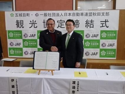 【五城目】日本自動車連盟(JAF)秋田支部(伊藤哲之支部長)は17日、五城目町(渡邉彦兵衛町長)と「観光振興に関わる協定」を締結した。五城目町の五城目朝市ふれあい館で開催された締結式には、同支部と五城目町の関係者が出席し、伊藤支部長と渡邉...