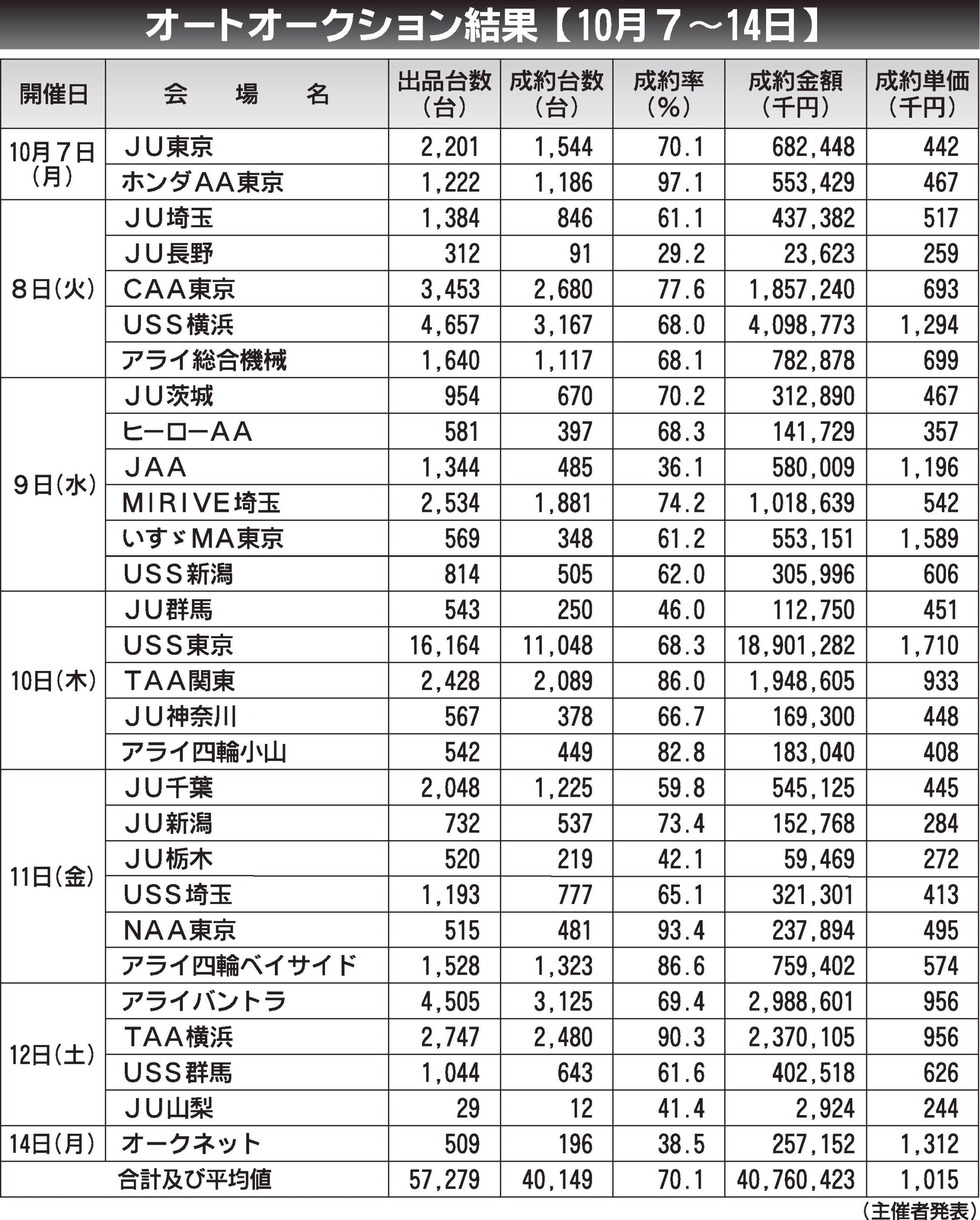 〈オートオークション結果〉首都圏 2024/10/7~14
