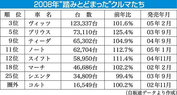 2008年の登録車市場が前年を6・5%下回る321万台に沈む中、発売から年月がたっているにもかかわらず健闘を見せた車種がある。代表格はハイブリッド車の代名詞であるトヨタ自動車「プリウス」とスズキ車のイメージを変えたと評価される「スイフト」...