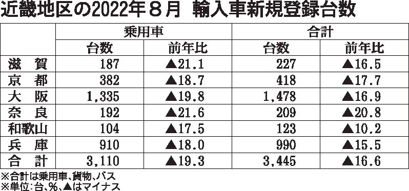 日本自動車輸入組合(JAIA)の発表によると、2022年8月の近畿地区の輸入車新規登録台数(外国メーカー車+日本メーカー車)は、前年同月比16・6%減の3445台となり、12カ月連続で前年台数を下回った。内訳は乗用車が同19・3%減の31...