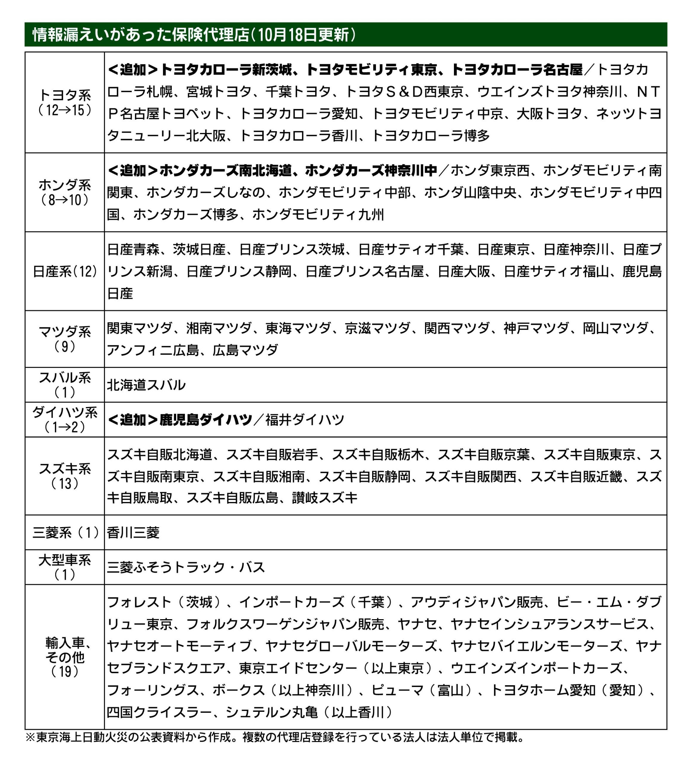 損害保険大手4社による一連の情報漏えい問題で、東京海上日動火災保険は10月18日、漏えいが判明した自動車ディーラーを含む保険代理店のうち、連絡先の分からない顧客がいる代理店が新たに6社確認されたと発表した。最初の10月1日の公表では66社だったが、11日に11社を追加。今回で83社になった。最新の一覧は同社ホームページで掲載している。