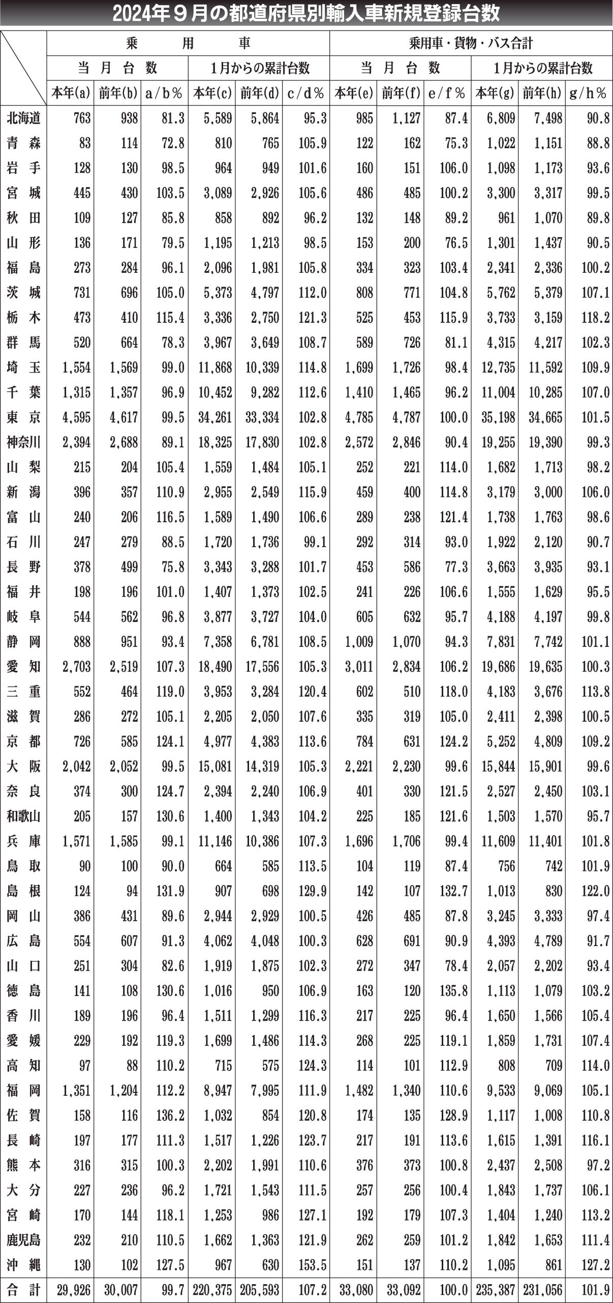 〈2024年9月の都道府県別輸入車新規登録台数〉