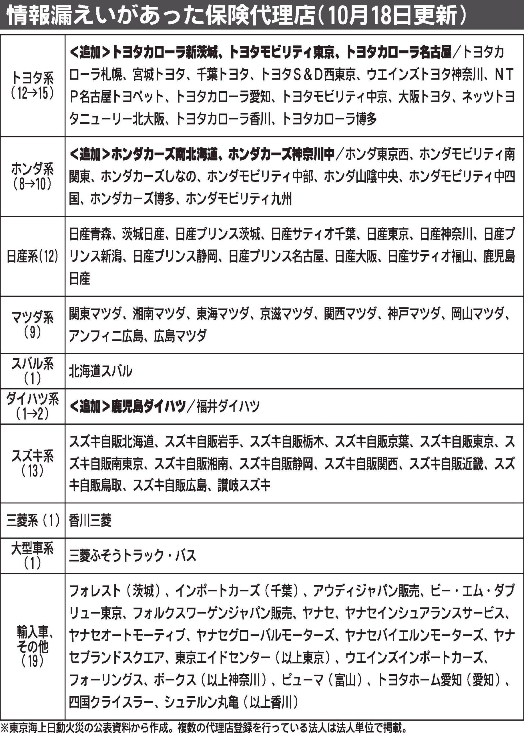 損害保険大手4社による一連の情報漏えい問題で、東京海上日動火災保険は、漏えいが判明した自動車ディーラーを含む保険代理店のうち、連絡先の分からない顧客がいる代理店が新たに6社確認されたと発表した。最初の10月1日の公表では66社だったが、1...