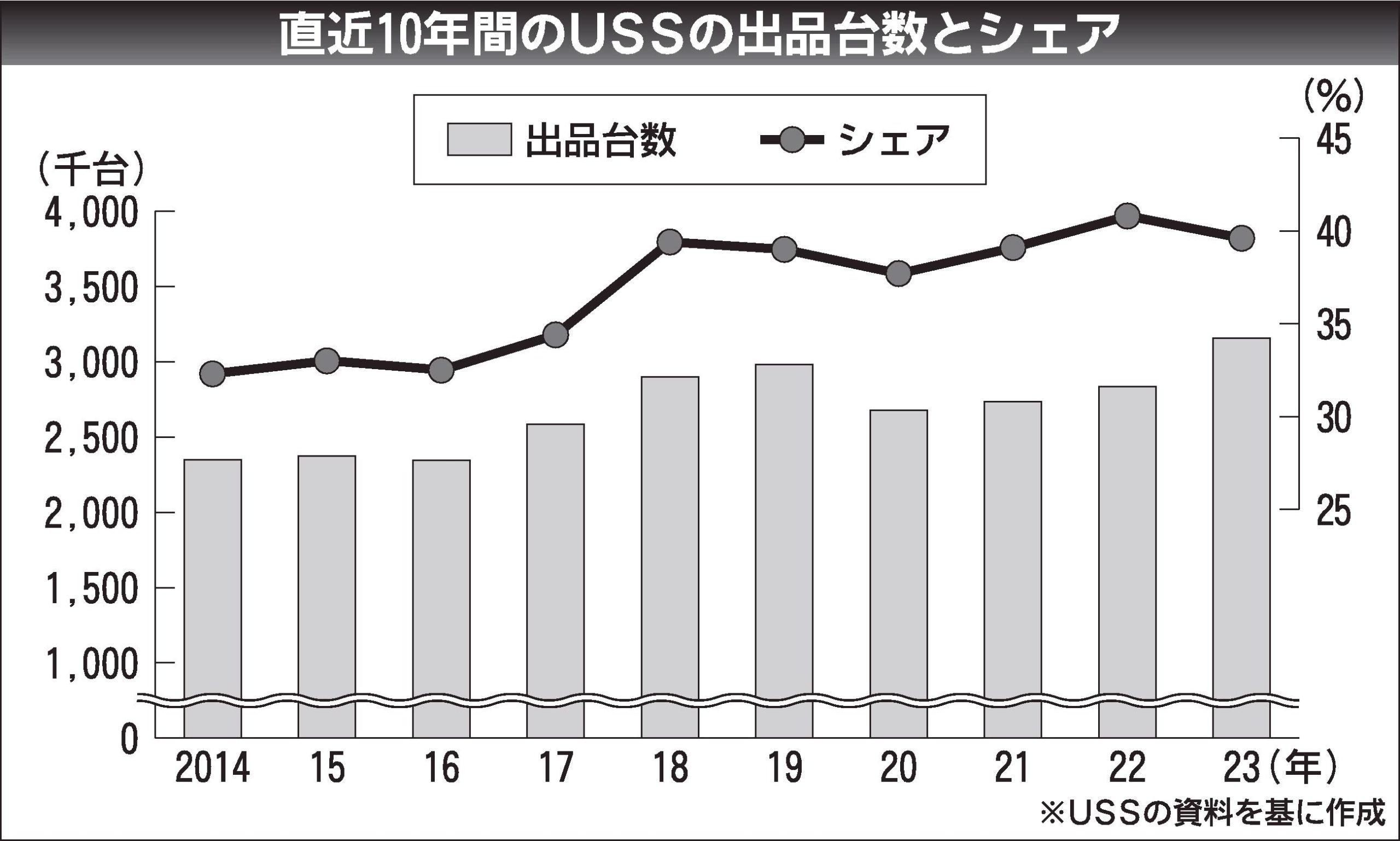 中古車オークション(AA)への出品で、ユー・エス・エス(USS)のシェアはここ数年、40%前後をキープしている。以前は30%台前半だったが、2017年に競合会場をM&A(企業の合併・買収)したことで2位以下に大きく差をつけた。AAでほぼ中...