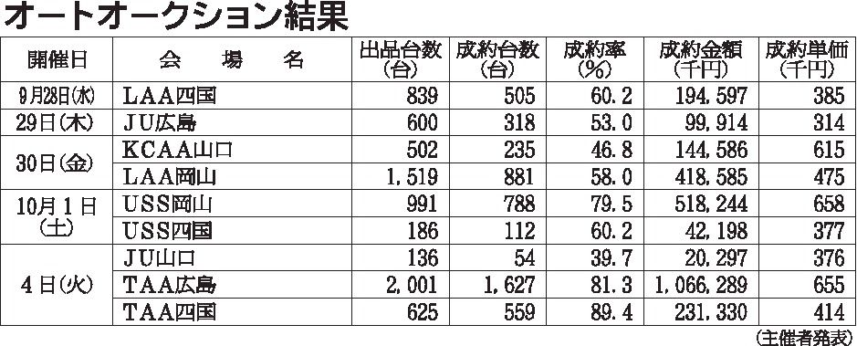 〈オートオークション結果〉中四国地区 2022/9/28~10/4