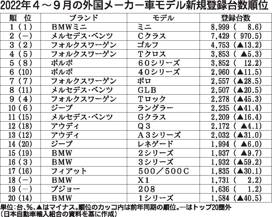 日本自動車輸入組合(JAIA、クリスチャン・ヴィードマン理事長)が6日発表した2022年度上期(4~9月)の外国メーカー車モデル別新車販売台数は、BMW MINI(ミニ)の「ミニ」が前年同期比8・6%増の8999台で14半期連続の首位とな...