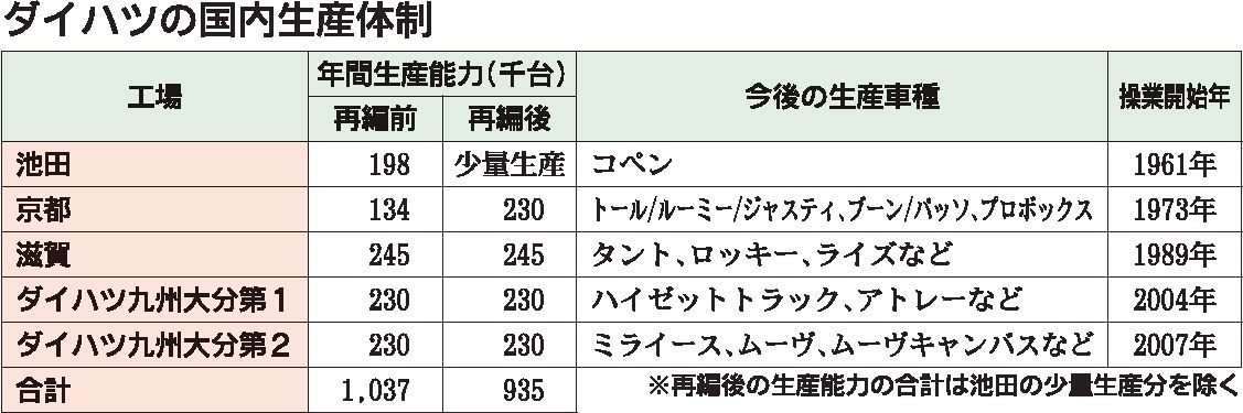 ダイハツ工業は国内の生産体制を再編する。京都工場(京都府大山崎町)の大幅改修工事が完了したのに合わせ、池田工場(大阪府池田市)の生産車種を京都工場に移管し、池田での量産車の生産を終了した。国内生産能力は1割減少し年間94万台になった。今後...